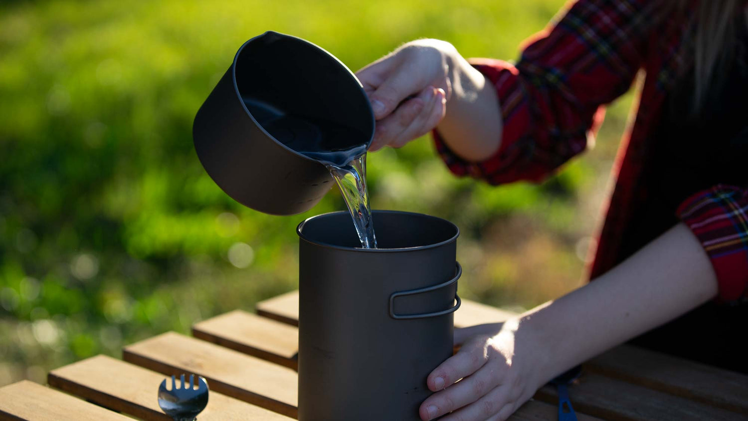 The 1.5 L and 0.8 L pots feature dual spouts, tall sides, and pure titanium construction for healthy, spill-free outdoor cooking.